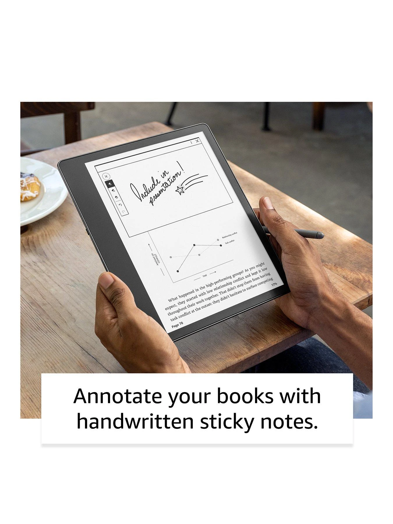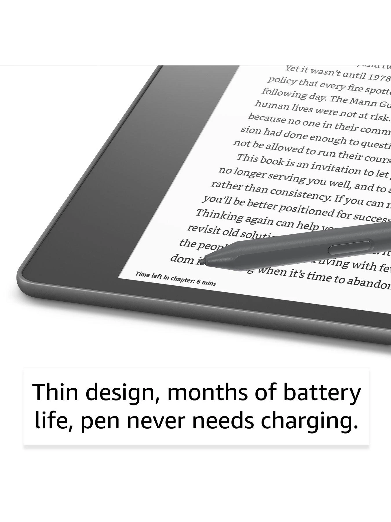 With a 10.2-inch, 300 ppi glare-free Paperwhite display, Kindle Scribe is perfect for reading and writing, even in direct sunlight. The large display gives you room to take notes or write a diary entry and makes it easy to adjust font size and margin width for improved reading comfort. Writing on Kindle Scribe feels like writing on paper. From the natural grip of the pen in your hand to the sound you hear when you write, Kindle Scribe’s surface is crafted for the best possible reading and writing experience.
