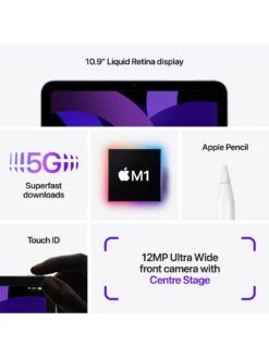 iPad Air. With an immersive 10.9-inch Liquid Retina display.1 The breakthrough Apple M1 chip delivers faster performance, making iPad Air a creative and mobile gaming powerhouse. Featuring Touch ID, advanced cameras, blazing-fast 5G2 and Wi-Fi 6, USB-C, and support for Magic Keyboard and Apple Pencil (2nd generation).3