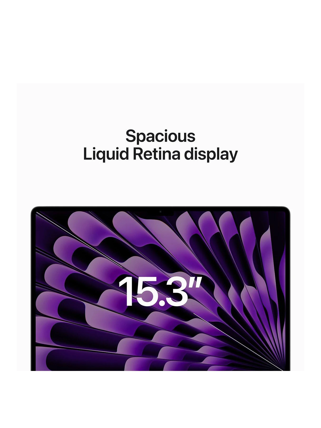 Additional information:1Battery life varies by use and configuration. See apple.com/batteries for more information. 2Compared with previous generation. 3The display on the 15-inch MacBook Air has rounded corners at the top. When measured as a standard rectangular shape, the screen is 15.3 inches diagonally (actual viewable area is less). 4Requires iCloud and internet connection.