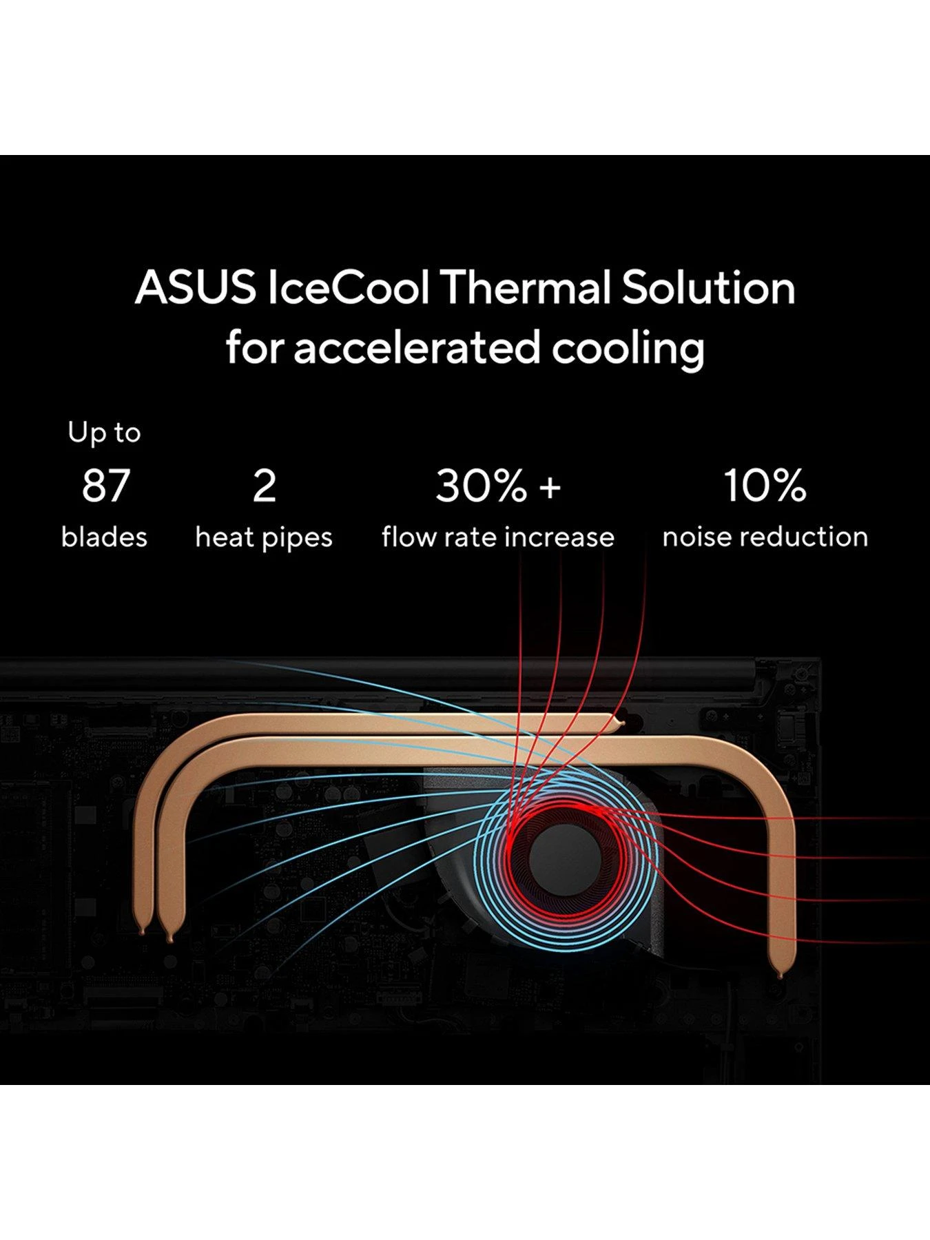 Exceptional heat dissipation comes via two upgraded heat pipes and an 87-blade IceBlades fan and impeller made of a liquid-crystal polymer.