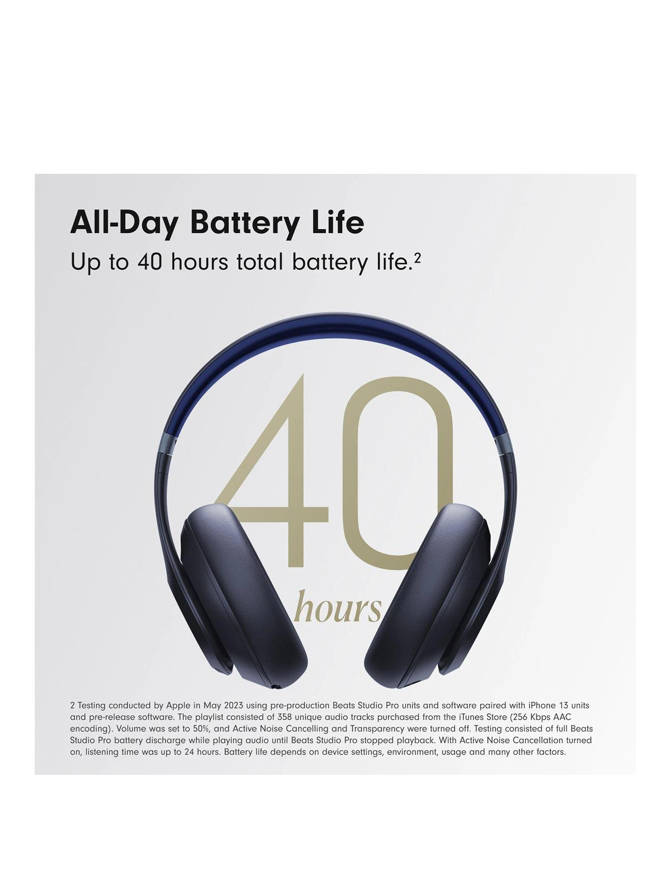 1. Not all content is available in lossless format. 2. Testing conducted by Apple in May 2023 using pre-production Beats Studio Pro units paired with iPhone 13 units. Volume was set to 50% and ANC and Transparency were turned off. Battery life depends on device settings, environment and usage 3. Requires an iCloud account and a compatible Apple device running the latest IOS software or a compatible Android device running Android 8.0 or later, with Google Play Services enabled.
