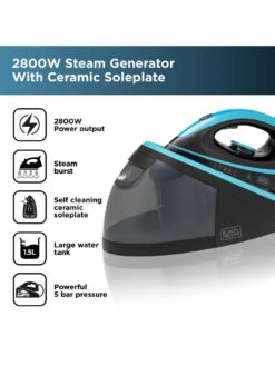 Glide through your ironing pile with the smooth ceramic soleplate of the BLACK+DECKER 2800W Steam Station. Heating up in less than 60 seconds with 135g steam burst and 5 bar pressure steam station, you can get a head start on your laundry.