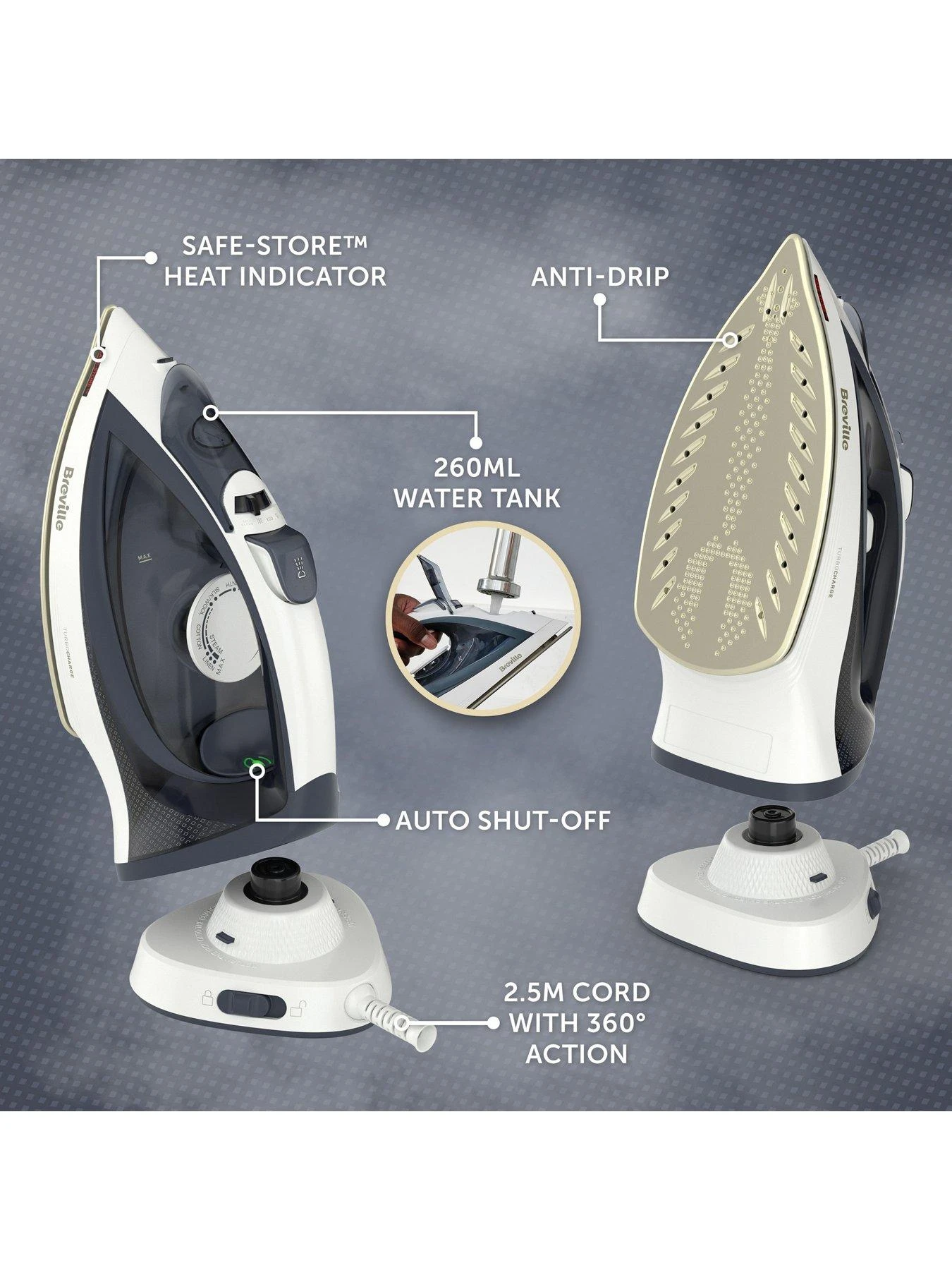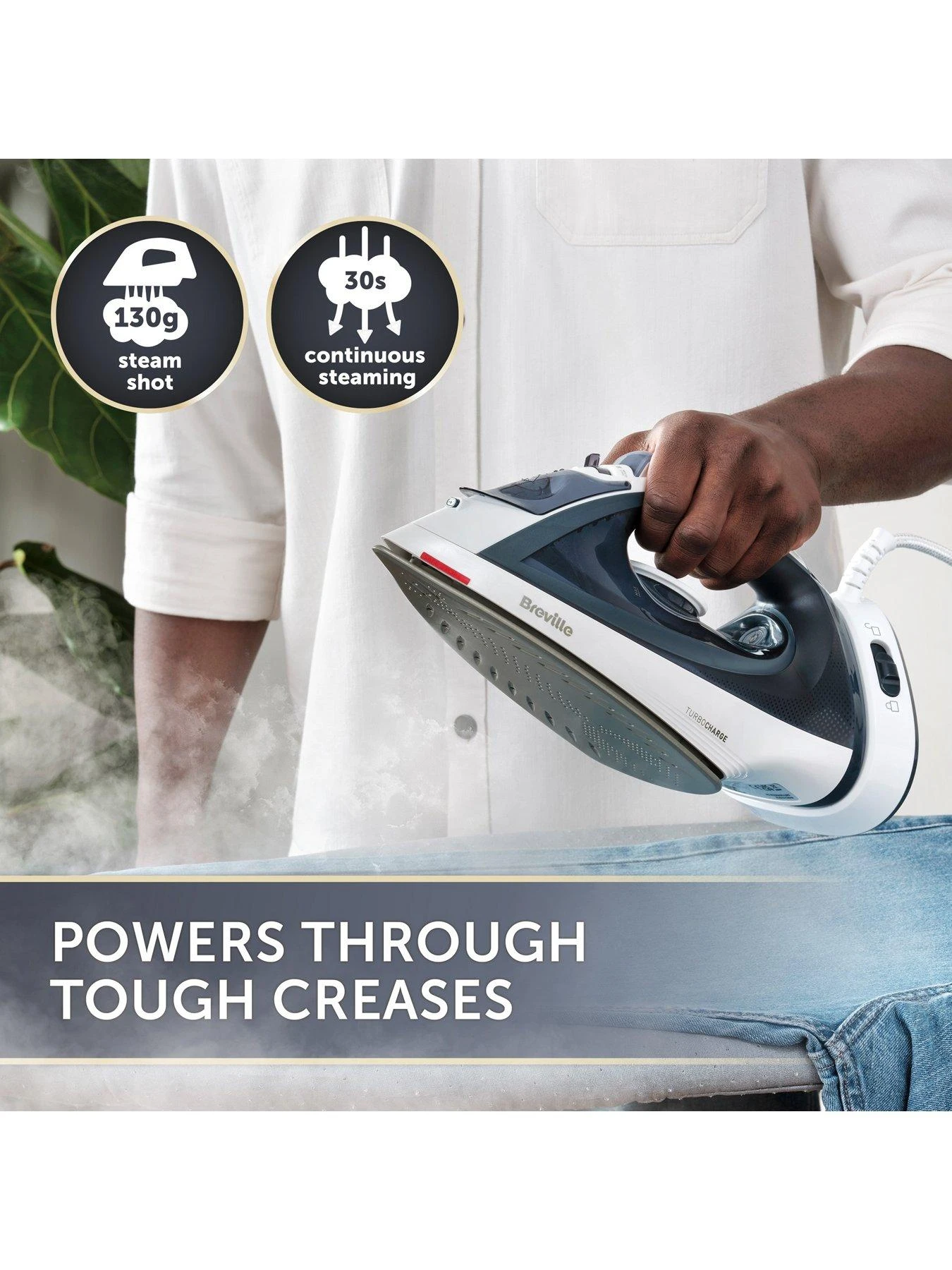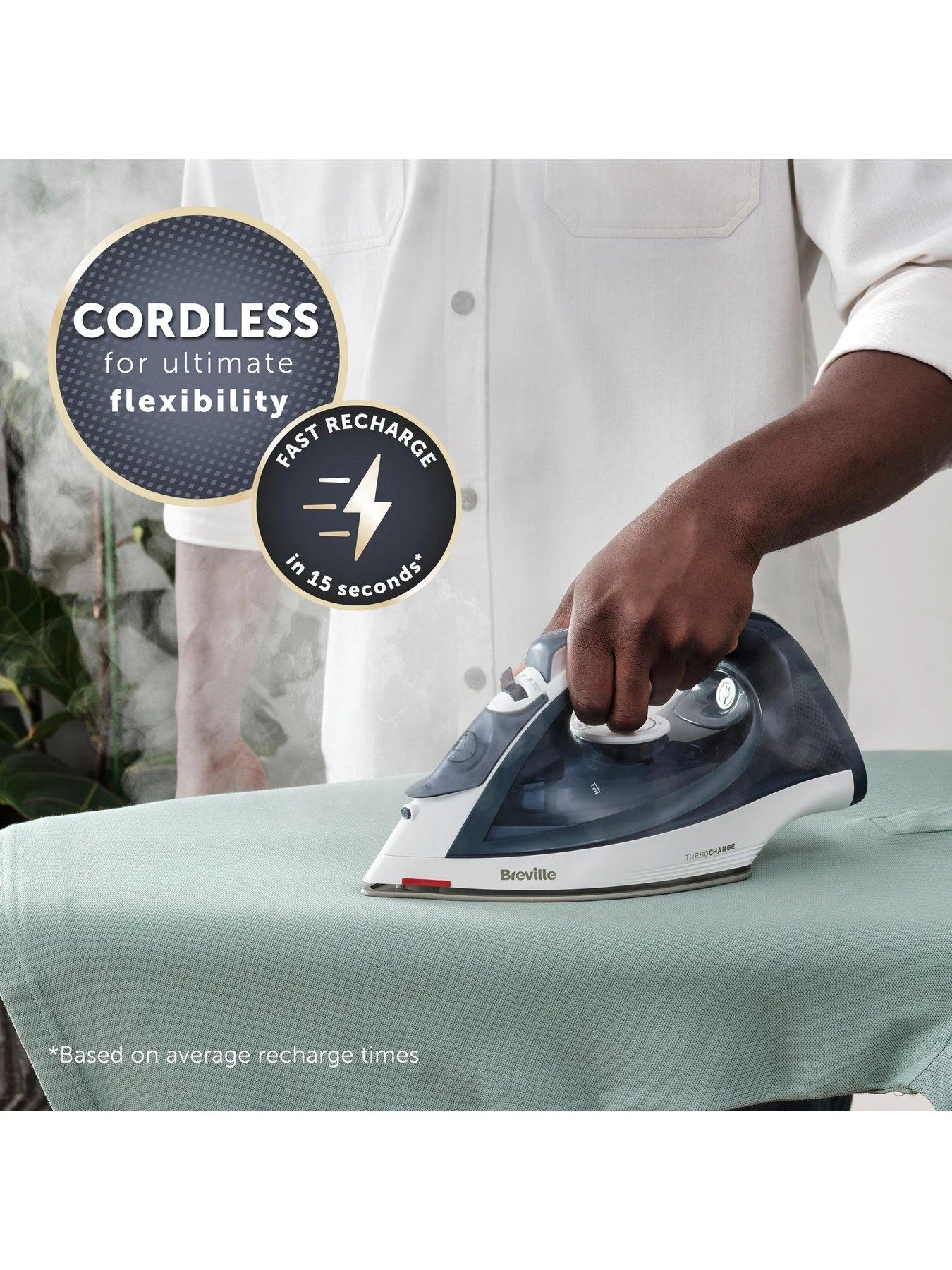 Glide through the laundry with totally unrestricted movement thanks to the Breville Turbo Charge Cordless Iron. The 360° Lock & Dock System allows you to easily dock and charge the iron, whilst also offering the flexibility to use in corded or cordless mode, plus the fast 30 second heat-up time and 15 second recharge time means there’s no waiting around to tackle your ironing pile. The 30g/min variable steam and 130g/min steam shot powers easily through tough creases, with 30 seconds of continuous steam for effortless wrinkle removal. As well as great performance, the Turbo Charge Cordless Iron boasts a variety of features designed to make your life easier. The Safe-Store heat indicator tells you when your iron is cool enough for storage and handling for extra safety. The self-cleaning function prevents the damaging build-up of limescale, plus an anti-scale filter and anti-drip feature ensure your steam iron always performs at its best. * Based on average initial heat-up and recharge times.