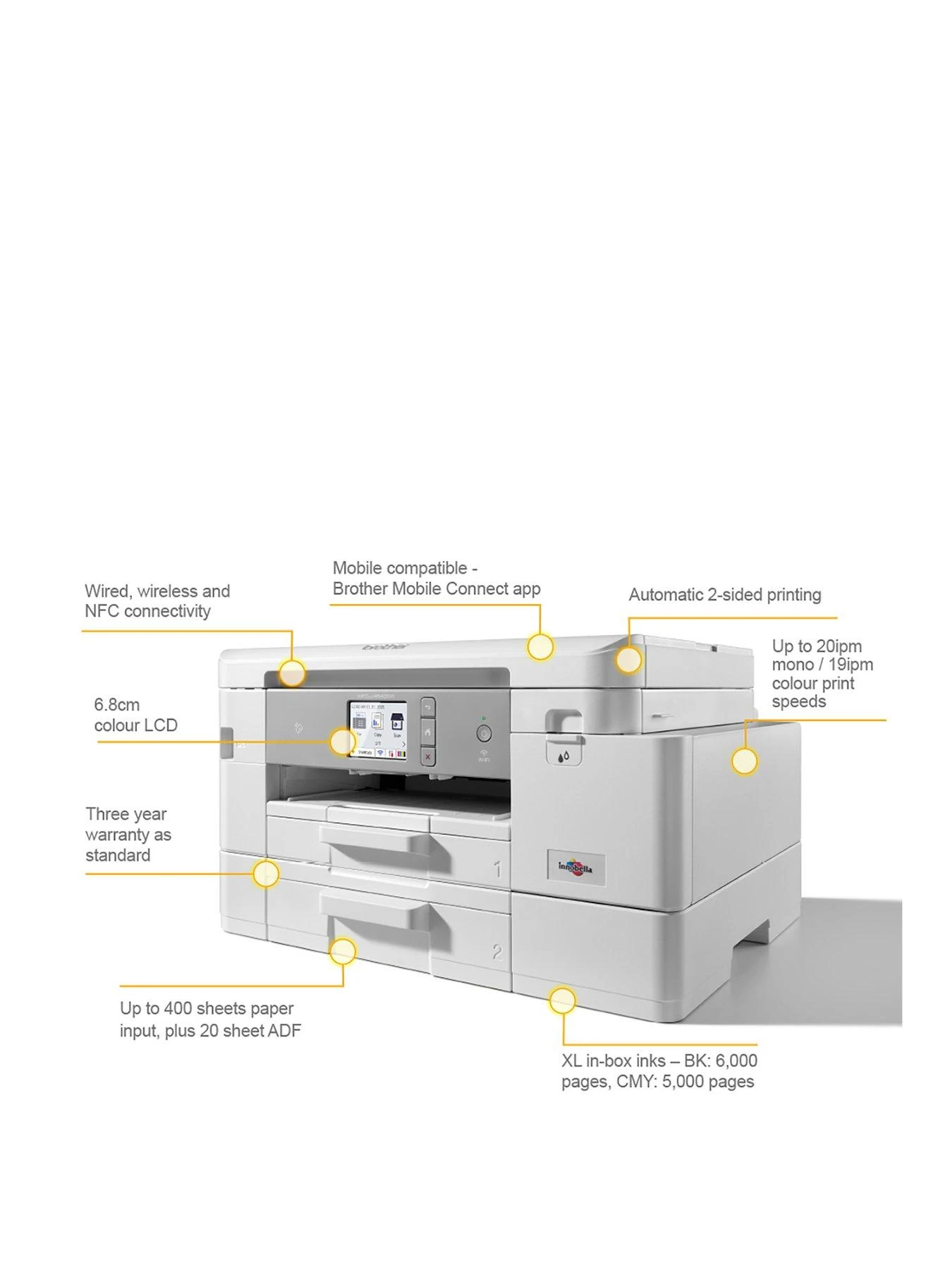 The Brother MFC-J4540DWXL is a solidly built, yet sleek, feature rich multifunction device offering high-quality printing for less. It comes with in-box inks printing up to 6,000 pages saving significant time and money. With an abundance of features and connectivity options, and a three year warranty as standard, the multifunctional MFC-J4540DWXL is the business device.
