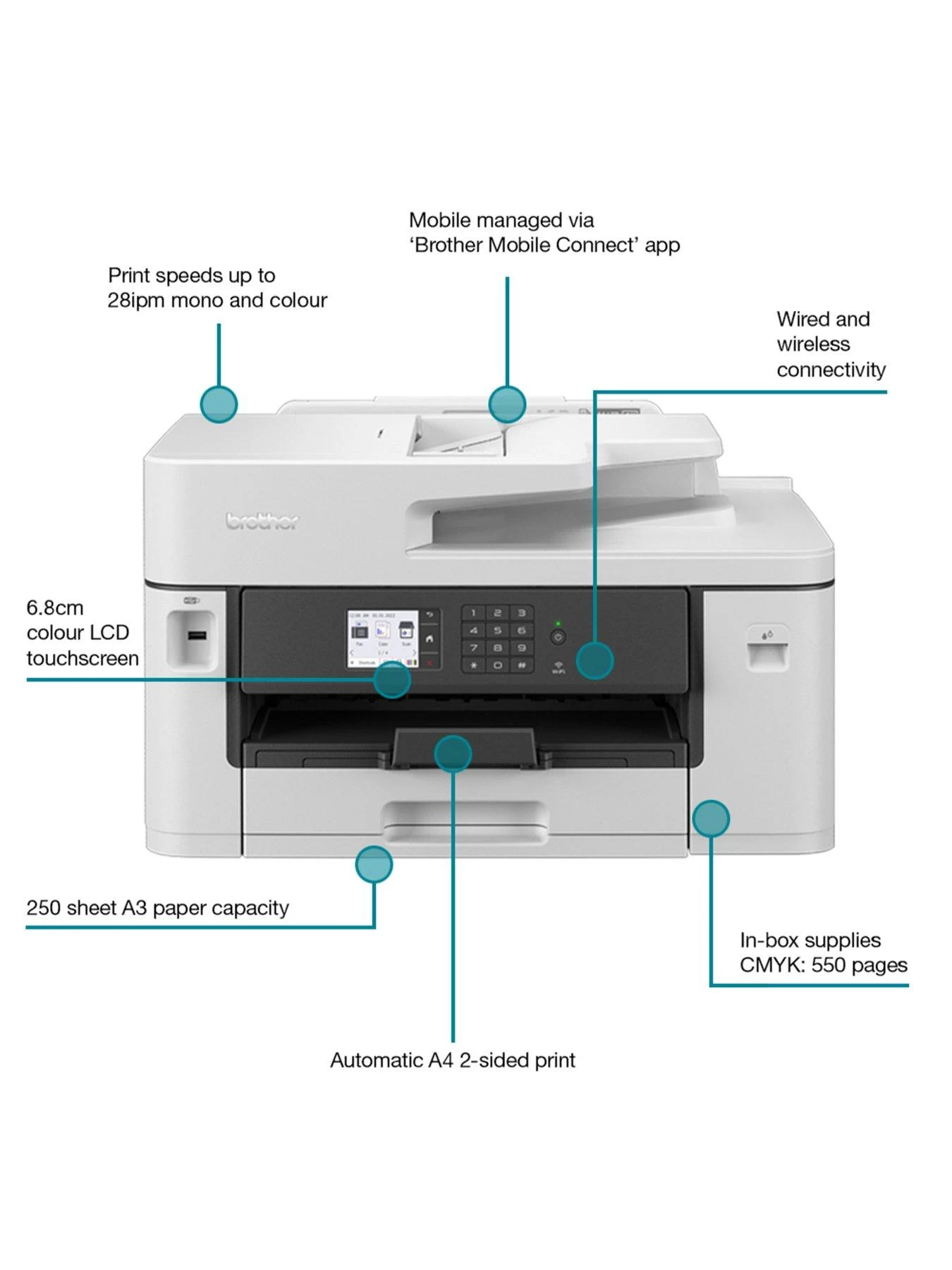 The Brother MFC-J5340DW all-in-one printer is built to last, meeting the needs of demanding small offices and business workgroups. The A3 print option enables you to produce larger documents, as well as A4 colour prints. You also get high quality prints, fast print speeds, 2-sided printing, a 250-sheet paper capacity and low running costs.