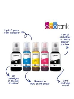 This economical printer saves you up to 90% on printing costs and comes with an extra black ink bottle for up to 3 years’ worth of ink included in the box. One set of ink bottles delivers up to 7,500 pages in black and 6,000 in colour, equivalent of up to 72 cartridges worth of ink!