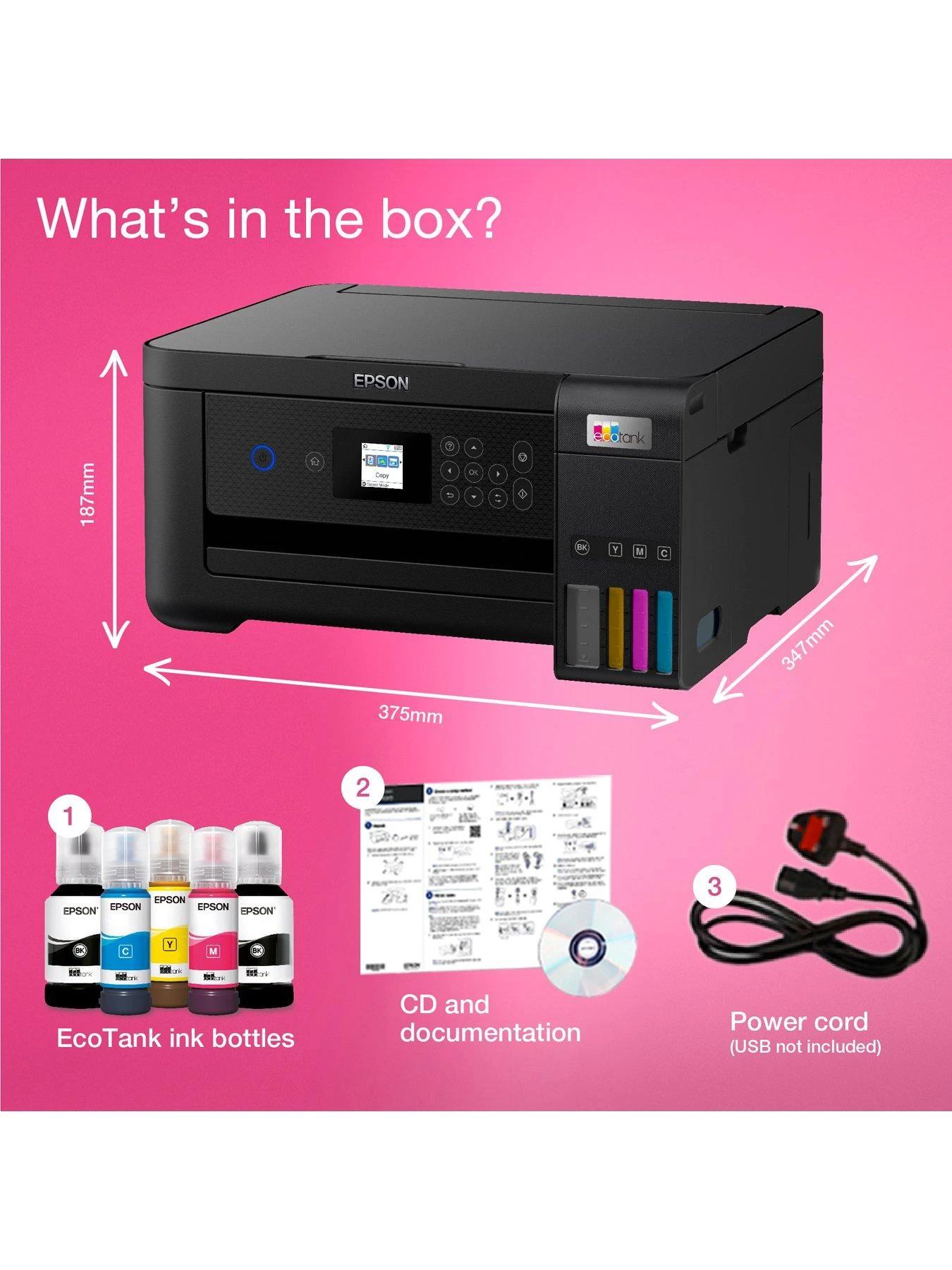 Enjoy mobile printing and an ultra-low cost per page with this multifunction inkjet printer with double-sided printing. Save up to 90% on printing costs with Epson’s cartridge-free EcoTank printers. Supplied with high yield ink bottles, the integrated ink tanks are easy to fill thanks to the specially engineered ink bottles. With no cartridges to replace, flexible connectivity features and double-sided printing, this is the perfect printer for anyone looking for high-quality prints at an incredibly low cost per page.