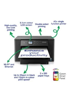 Get professional-looking prints quickly and without breaking the bank with the high quality, easy-to-use and compact WF-7310DTW printer. Its fast 25ppm print speeds, dual paper trays plus rear paper tray ensure efficiency. Low cost hardware and affordable individual inks make this a low-cost solution for small businesses.