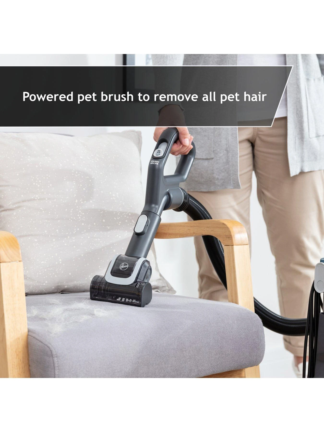 - Mini turbo brush with rotating bristles gets deep into the fabric to loosen cat or dog fur and vacuum it into the dust collection chamber.