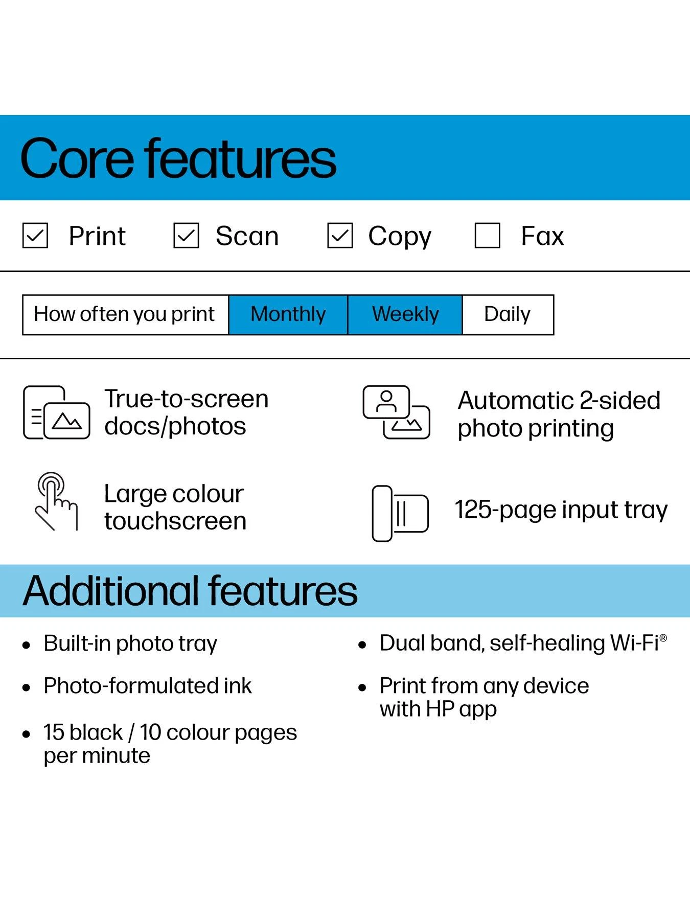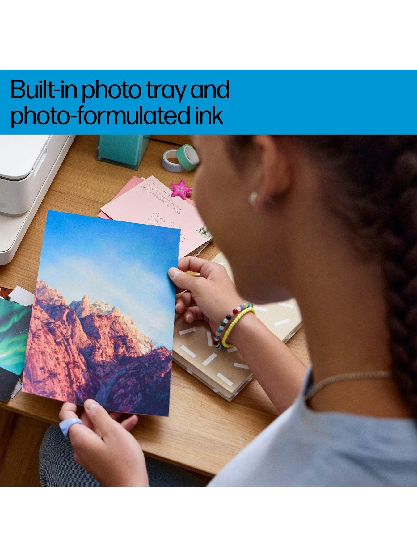 - Conveniently print photos in a variety of sizes with a built-in photo tray. Use HP Smart for easy multitasking- print, scan, copy from any device.