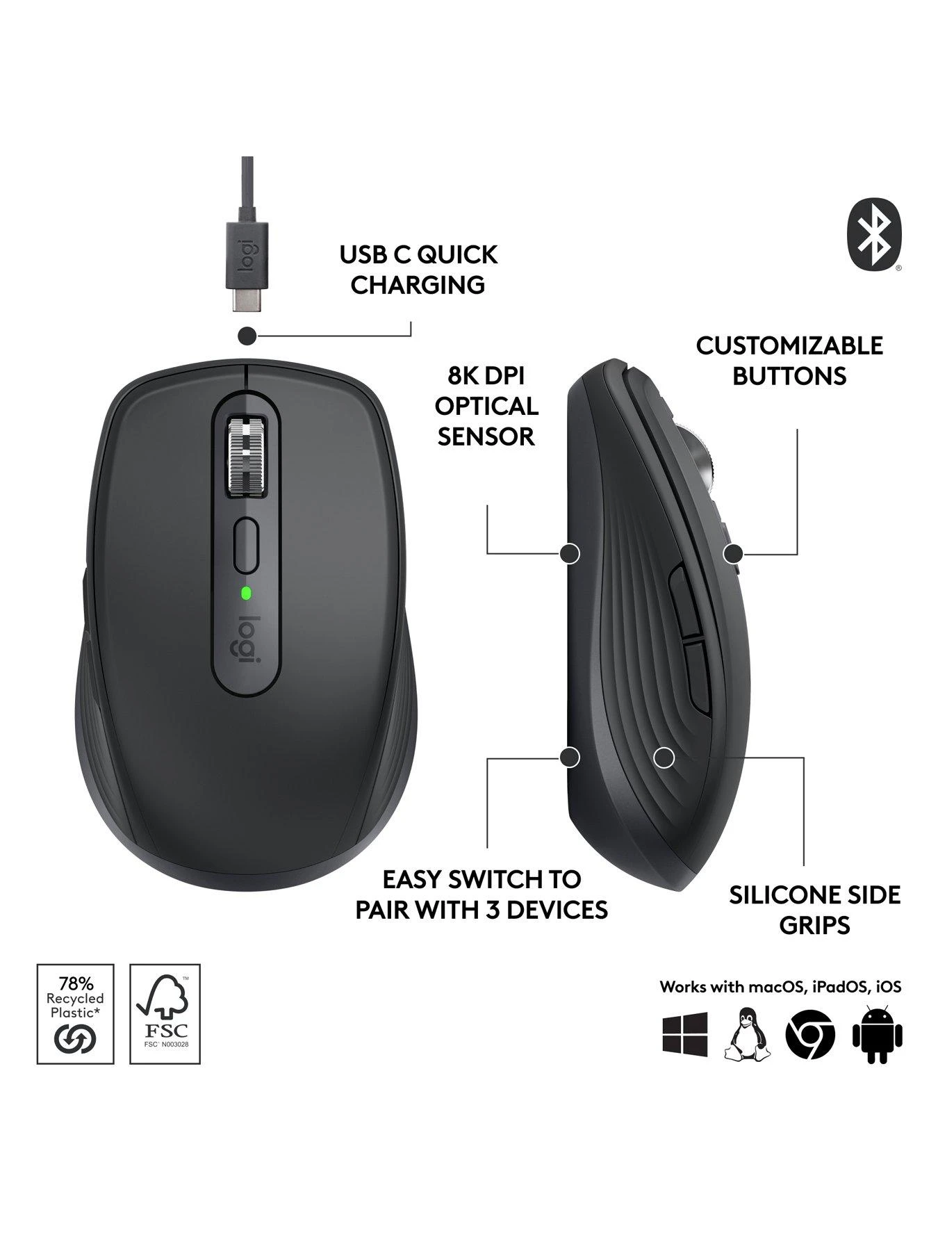 • Tracks Anywhere, Goes Everywhere: Work on any surface, even glass, with MX Anywhere 3S Bluetooth Mouse.