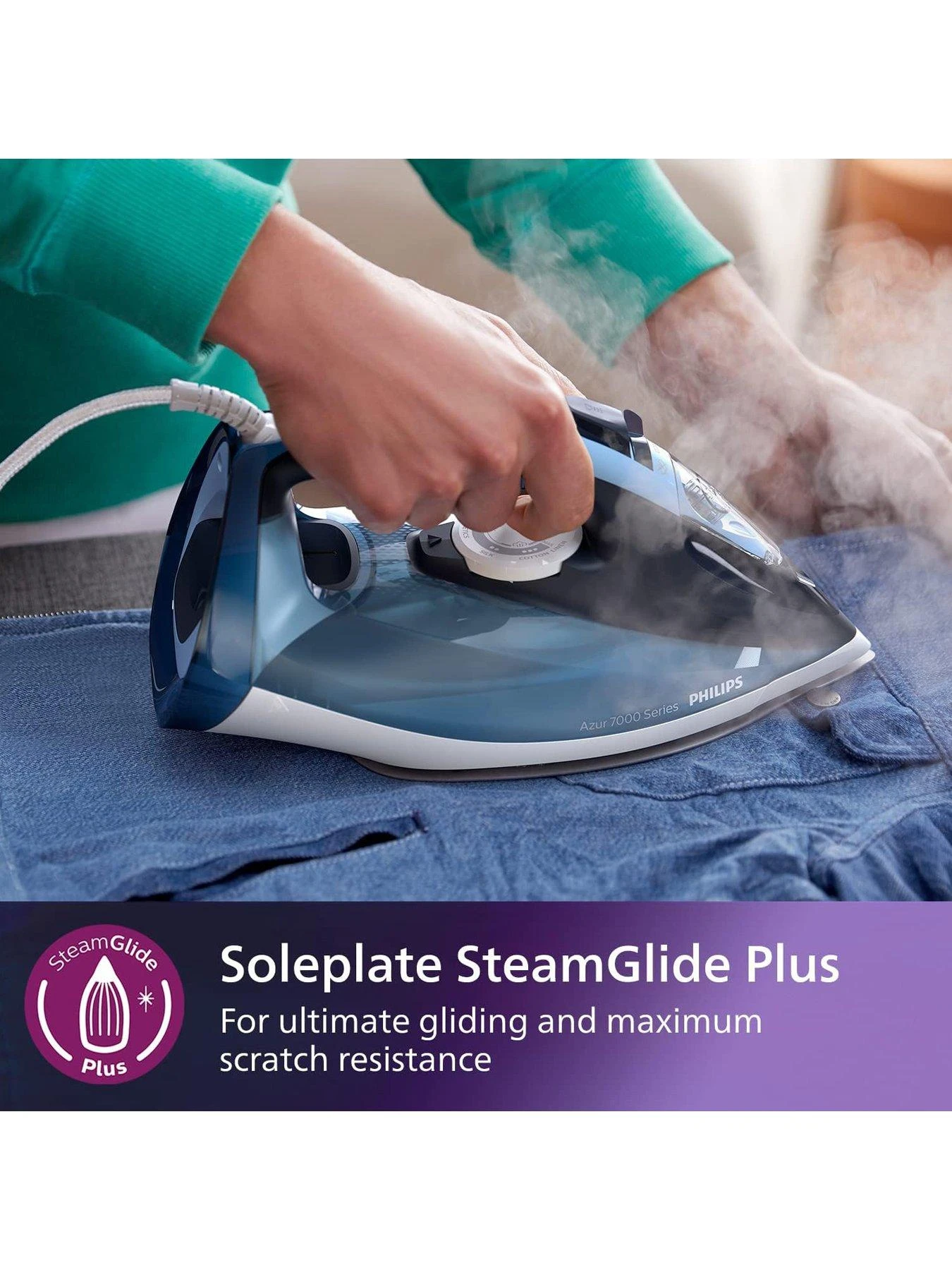 Azur 7000 Series: Long-lasting performance with Quick Calc Release. Thanks to our improved steam boost up to 250g steam boost blasts stubborn creases. Drip-stop system keeps garments spotless while ironing. SteamGlide Plus soleplate. Continuous steam output 50 g/min for faster crease removal, 2800w for quick heat-up and powerful performance. Less refilling with extra-large 300ml water tank. Vertical steam. Easy temperature control, and SteamGlide Plus soleplate with enhanced scratch resistance.
