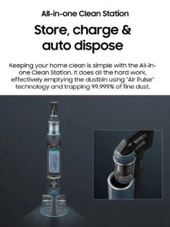 Keeping your home clean is simple with the All-in-one Clean Station. It does all the hard work, effectively emptying the dustbin using Air Pulse technology and trapping 99.999% of fine dust for maximum hygiene, while recharging the battery at the same time.