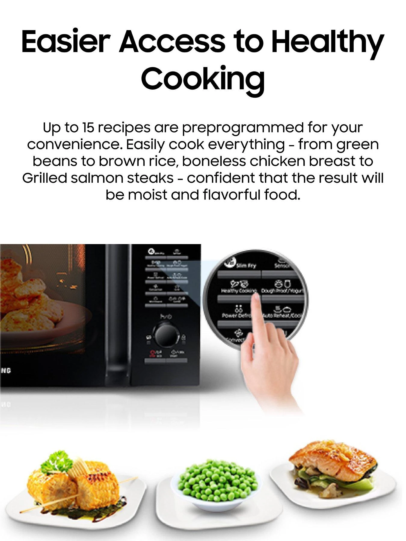Up to 15 recipes are pre-programmed for your convenience. Easily cook everything – from green beans to brown rice, boneless chicken breast to grilled salmon steaks – confident that the result will be moist and flavourful food.