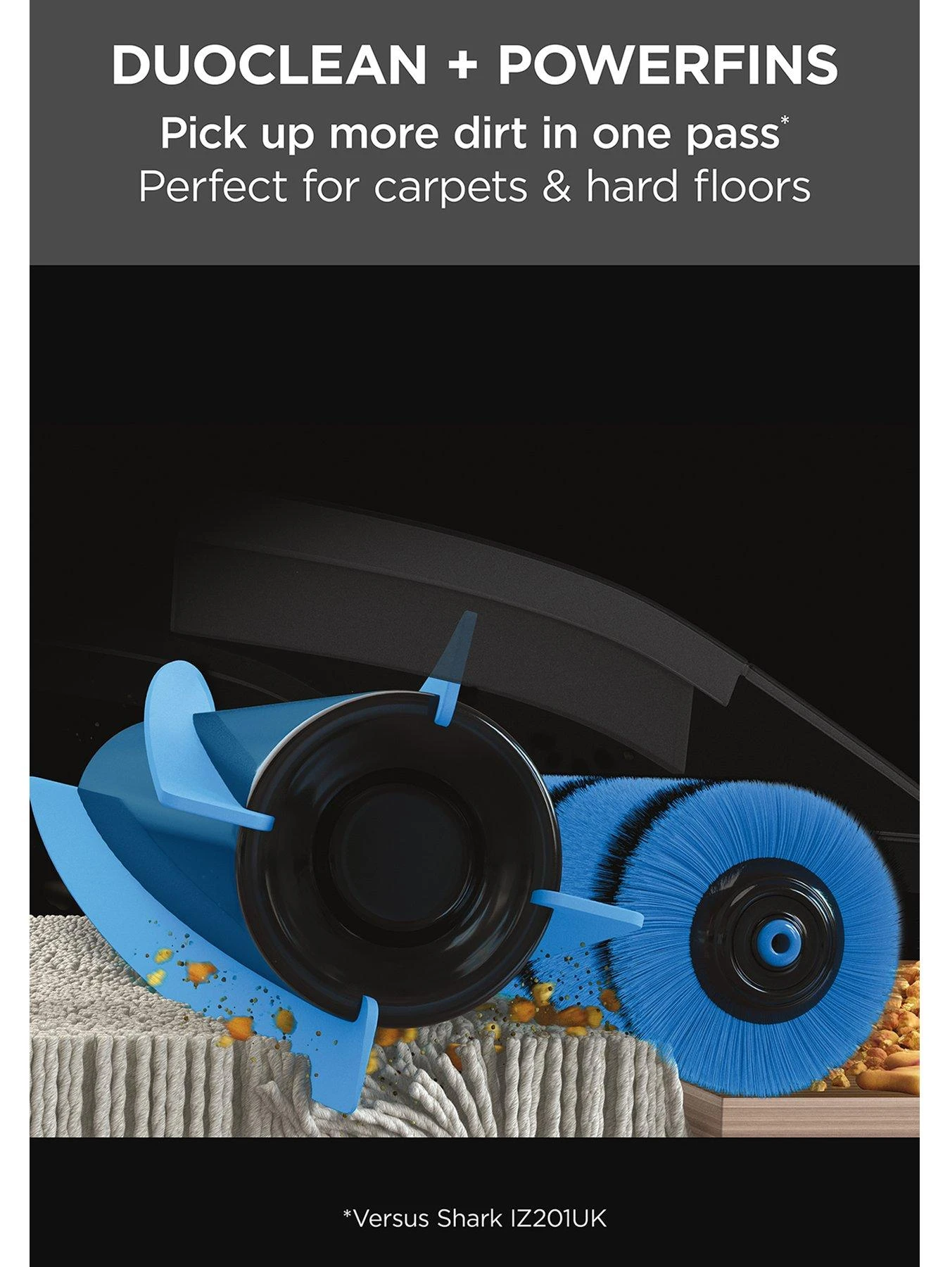 Two motorised brush-rolls work together in Shark’s signature DuoClean floorhead, gliding across all floor types. Now enhanced with PowerFins – pick up more dirt in one pass**. This innovative brush-roll design digs deep into carpets to agitate dirt and directly engages hard floors for a deep clean, while a soft front brush-roll draws in debris and lifts stuck-on dust from hard floors. LED headlights in the floorhead also illuminate hidden dust.