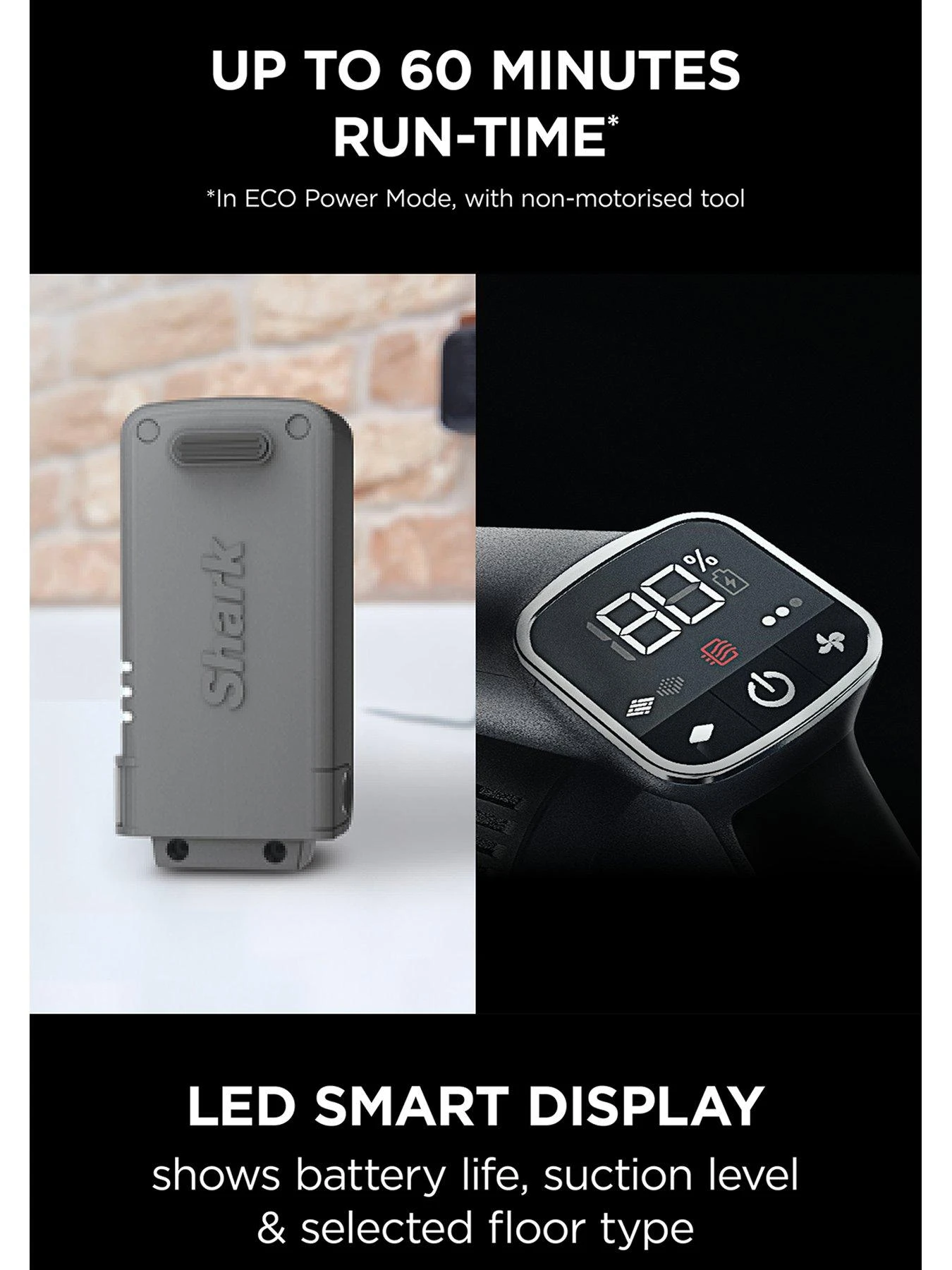Enjoy up to 60 minutes*** run-time per charge. The removable battery can be charged on or off the vacuum, wherever suits you. Easily see how much battery life you have remaining with the LED Smart Display.