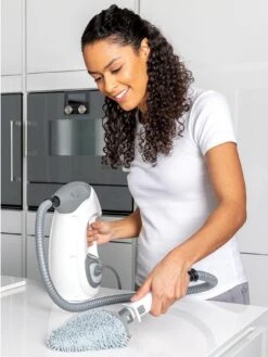 Easily lifts stubborn, stuck-on dirt with a direct blast of steam. Standby mode pauses the steam so you can easily take a break. Simply detach the handheld unit to effortlessly steam clean all sealed surfaces, including tiles, hobs, ovens, sinks, showers, grouting, windows and worktops. Easily tackle corners, edges and crevices with 5 accessories included in the box.