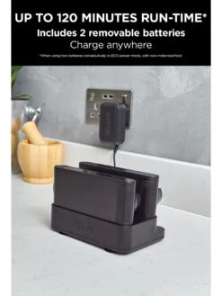 Enjoy up to 120 minutes of run-time**. The removable batteries can be charged on or off the vacuum, wherever suits you – you can even charge both batteries at once in the Dual Charging Dock. (**When using two batteries consecutively in ECO power mode, with non-motorised tool.)