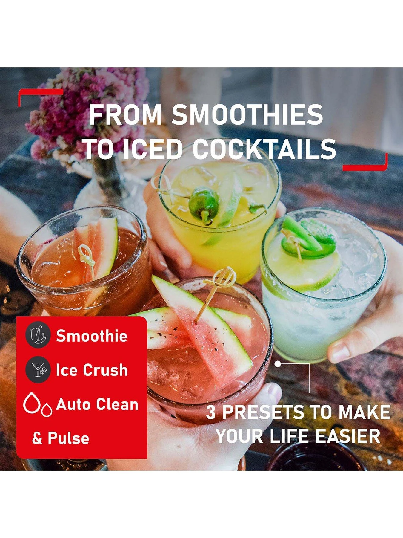 Complete with 3 pre-set programmes, Smoothie, Ice Crush and Auto Clean, and a spatula for stubborn ingredients. 2L thermo-resistant jar holds hot or cold contents, and caters for the whole family. Stainless-steel blades are dishwasher safe.