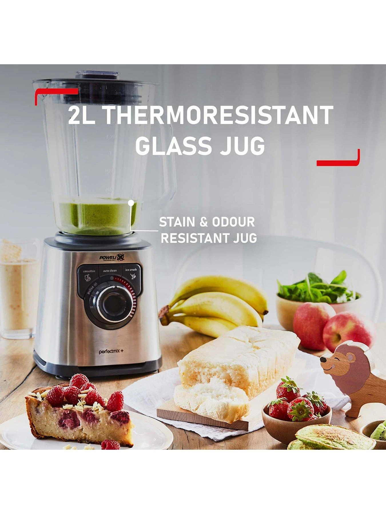 - 2L thermo-resistant glass jug for hot and cold ingredients; holds enough for the whole family