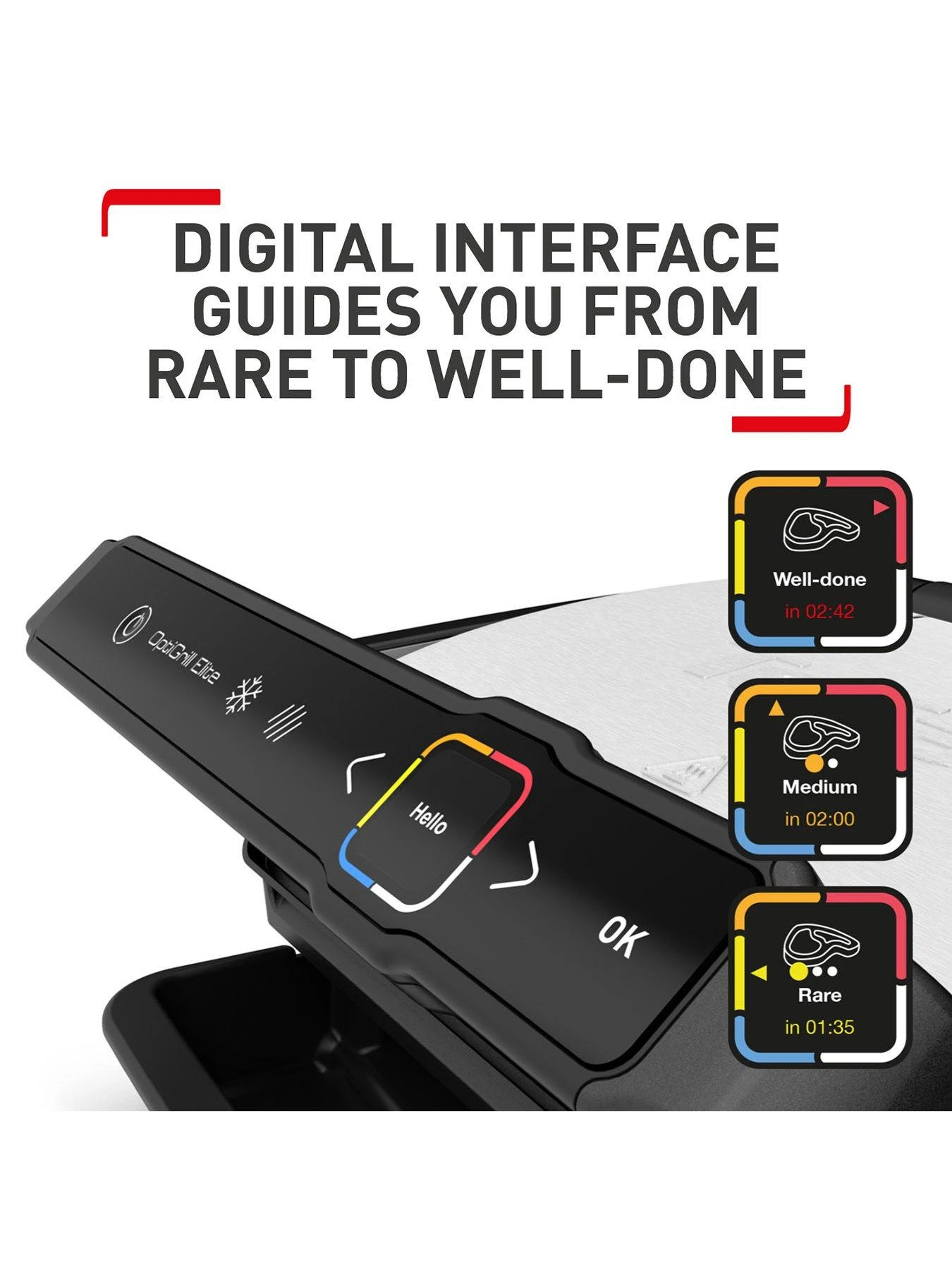 This fantastic innovation measures the thickness of your food then sets the cooking time and temperature accordingly to produce perfect results every time. OptiGrill Elite will even guide you step-by-step from rare to well-done using a cooking level indicator and digital screen with integrated countdown timer.
