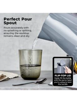 Using the flip-top lid, you can easily refill the kettle as required while keeping an eye on the water level indicator window. A perfect pour spout prevents any spillages, while the removable and washable filter ensures you enjoy the best taste possible. Boil dry protection automatically switches the heating element off if there’s no water inside the kettle.