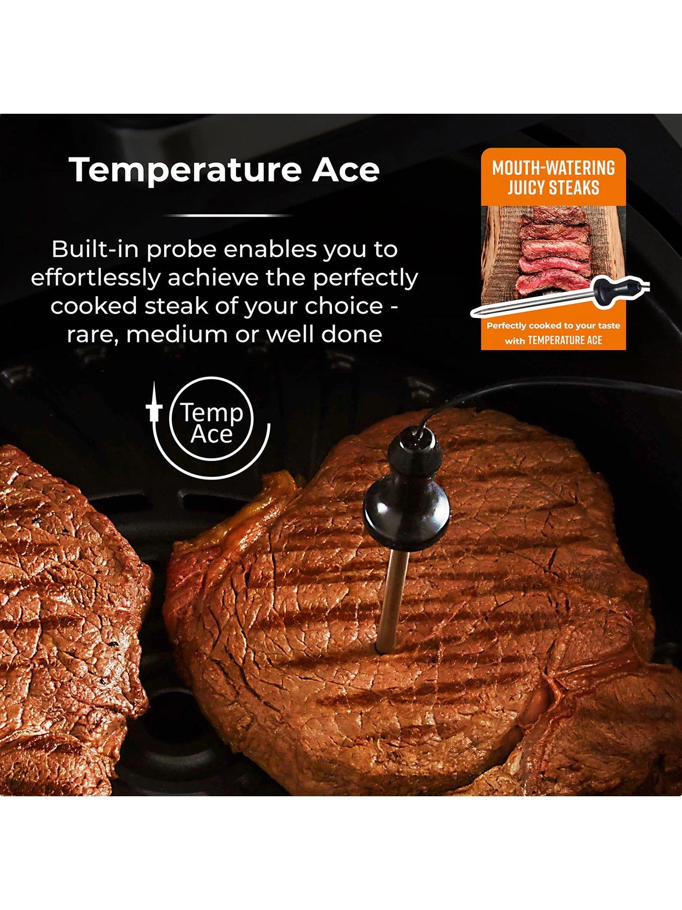 Hotter than most conventional ovens, the heat soars up to a sizzling 265°C and circulates around your food to expertly chargrill succulent steaks and crisp off breaded chicken. Enjoy perfectly cooked steaks with the Temperature Ace feature. The air fryer monitors the internal temperature and cooks steak just to your taste, from a juicy medium-rare to a deliciously charred well done. Bring deliciously chargrilled food indoors without the fumes using smokeless grilling – ideal for a rainy summer days.