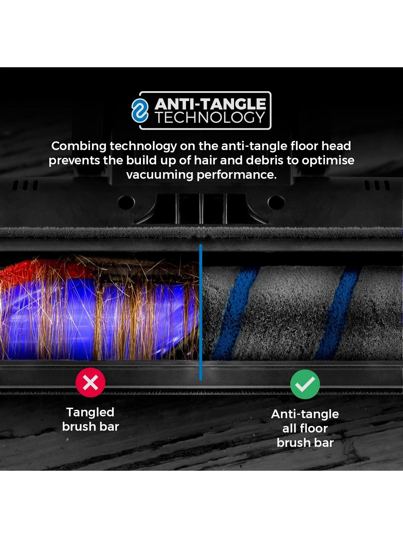 The 3-in-1 floor head includes an anti-tangle brush head, which prevents hairs from tightly wrapping around the brush bar, ensuring continuous smooth running.