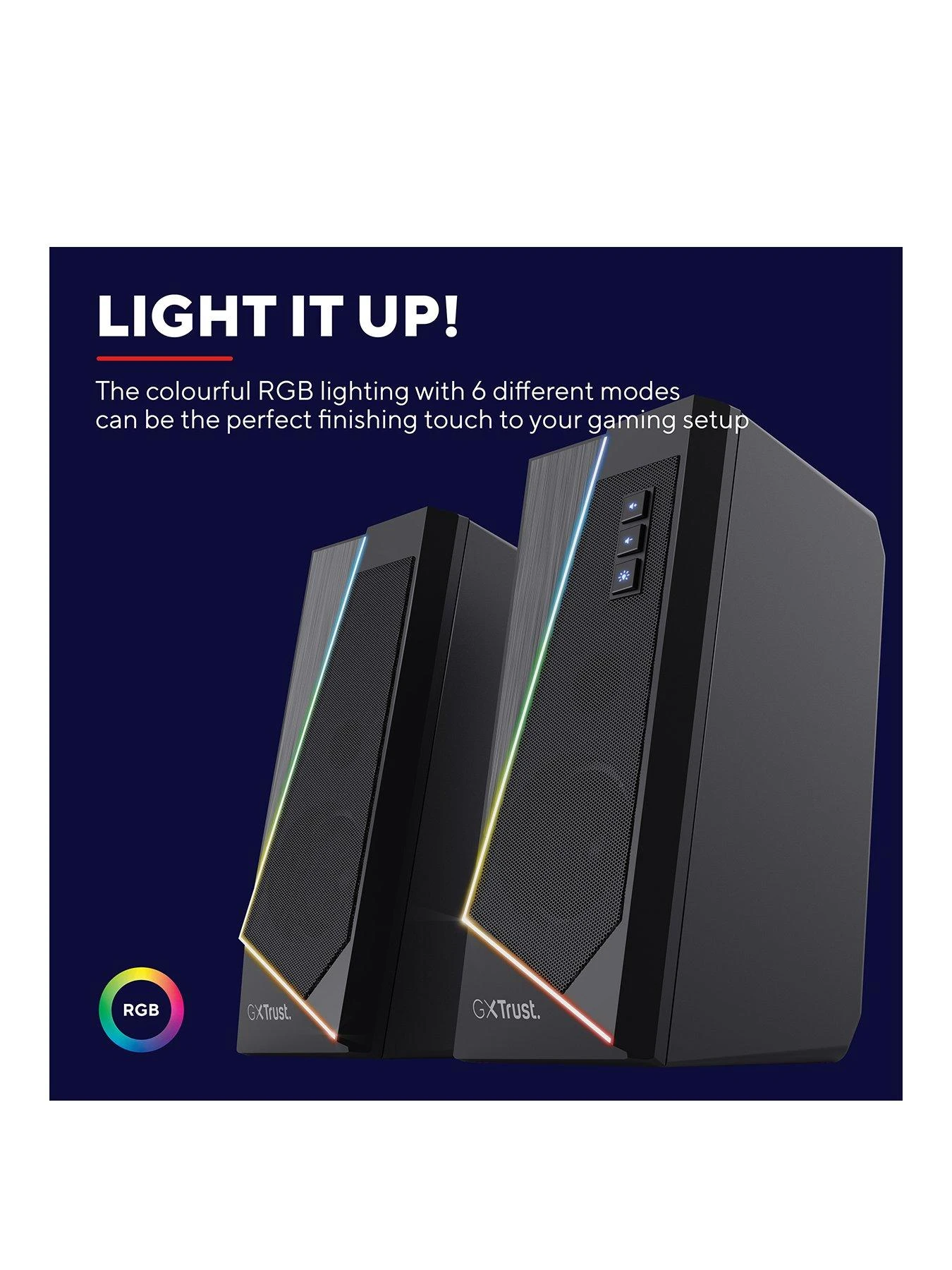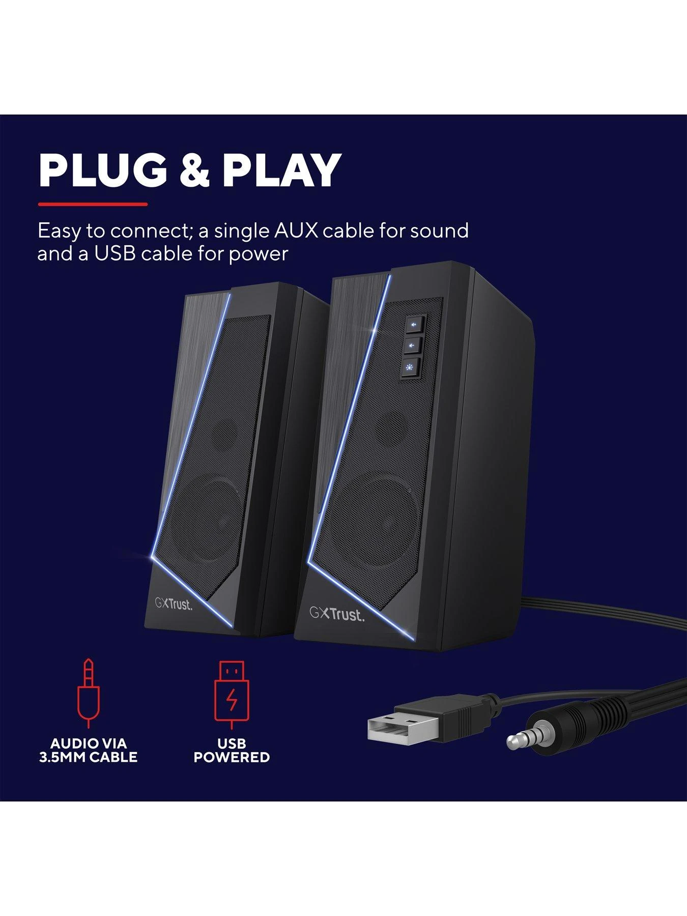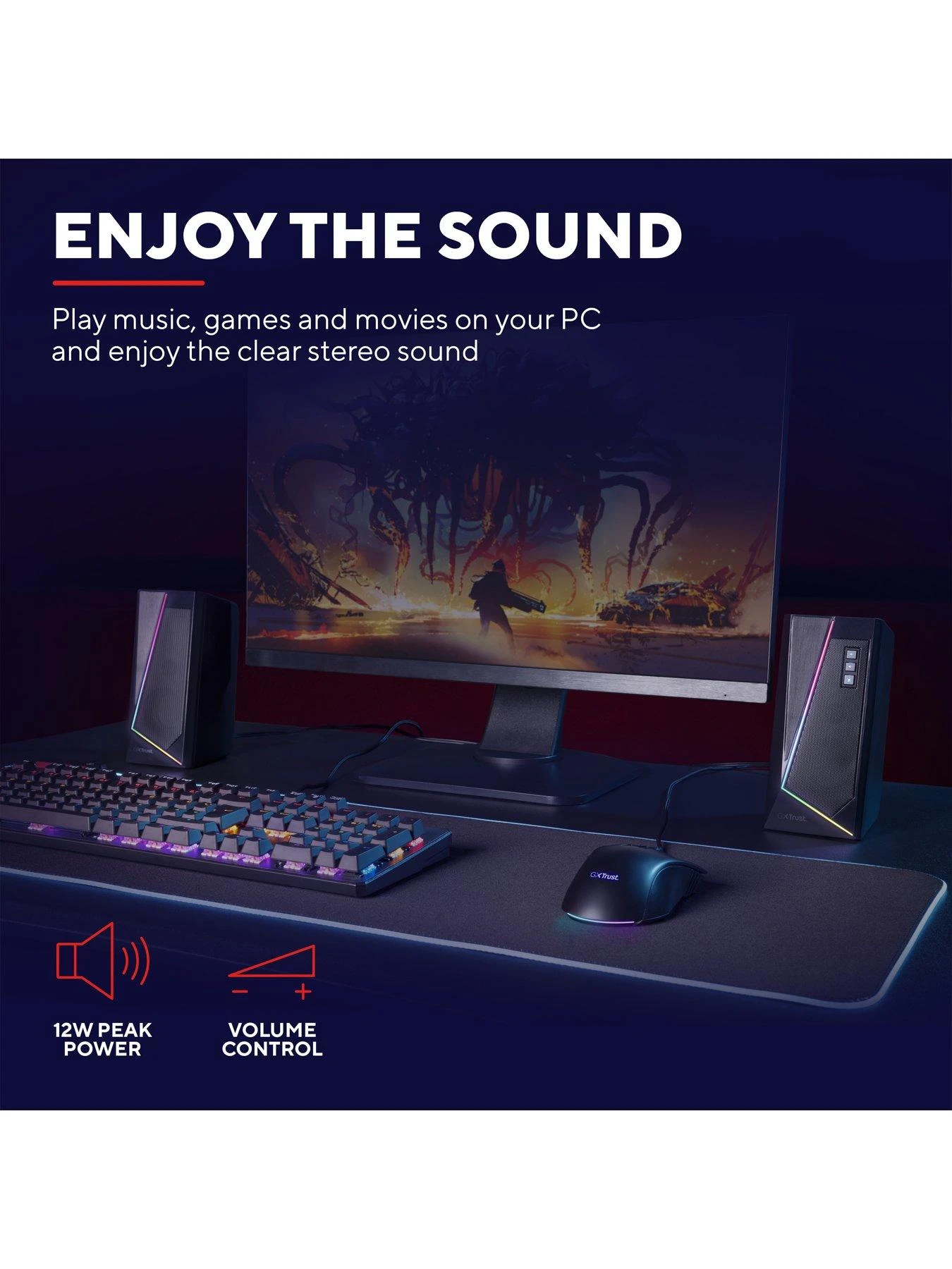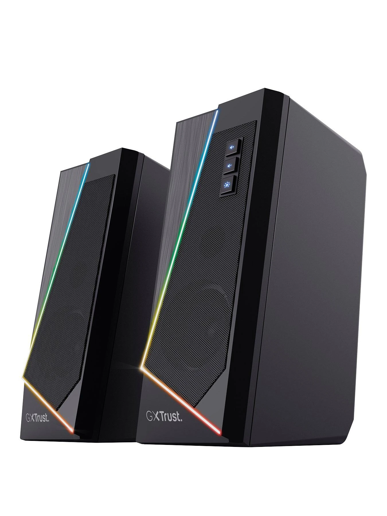 With a sleek design and subtle RGB lighting, the Trust GXT 609 Zoxa is a stylish addition to any desk. On top of that, this stereo-speaker set is easy to use and it doesnāt even need a wall plug. They turn on automatically when switching on your PC.