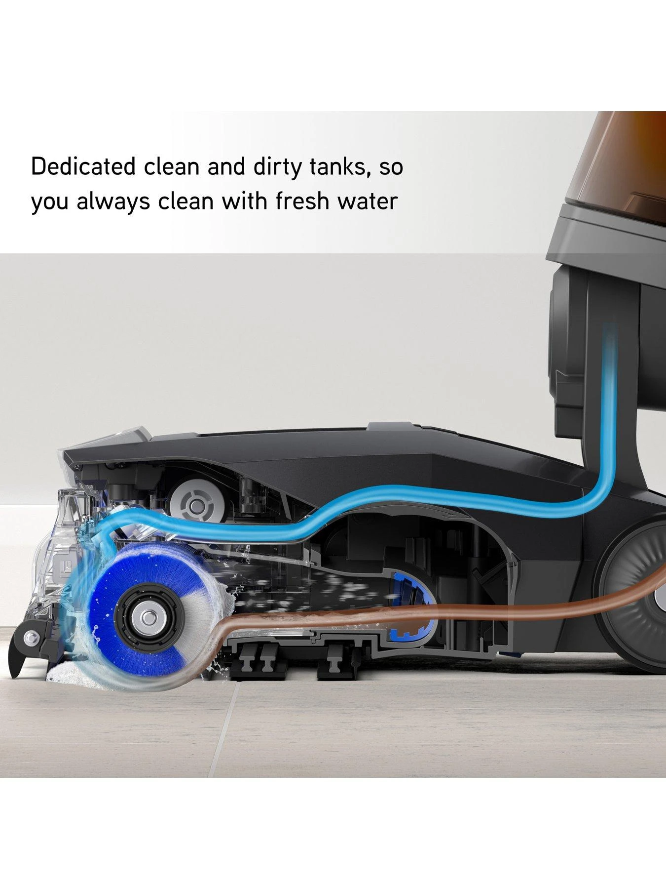 The dedicated clean and dirty tanks mean that you will always clean with fresh water. Clean water and cleaning solution are dispersed onto the brush rolls, and the dirty water is extracted directly into the separate tank for a thorough, hygienic clean.
