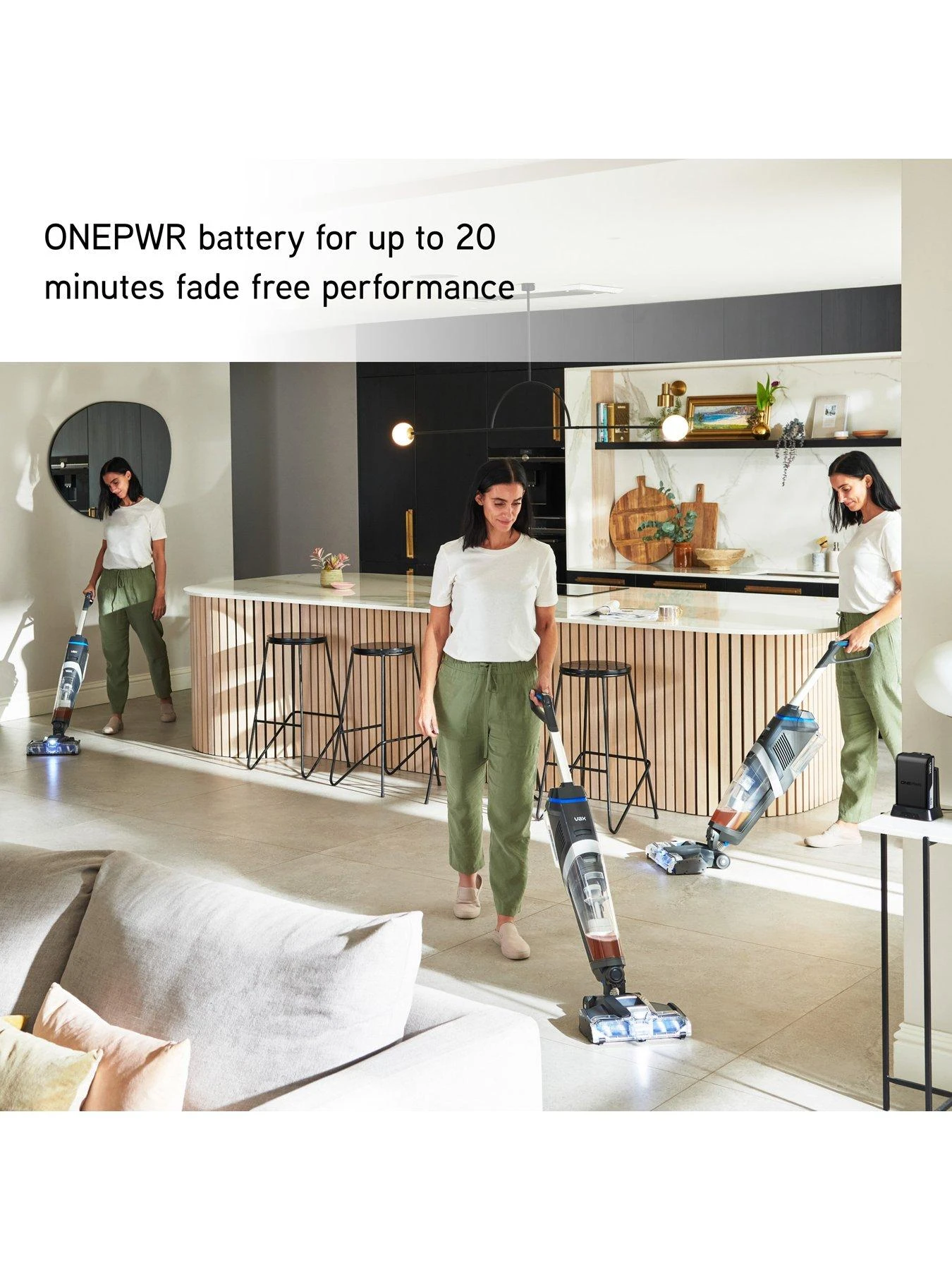 Vax’s ONEPWR battery provides fade-free performance for up to 20 minutes. That’s enough time to clean the average UK kitchen more than twice**.