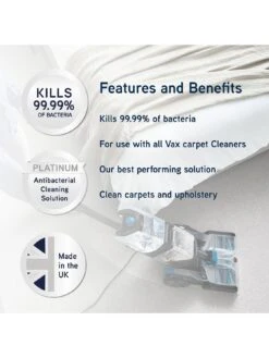 Scientifically formulated by the UK’s number 1 brand in carpet washing, Vax Platinum Antibacterial Solution provides high-performance cleaning, now with antibacterial properties and combats pet odours.